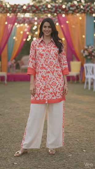 The shirt features a structured collar with a button-down front and statement sleeves finished with contrasting orange borders for a refined touch. Paired with comfortable straight-fit white pants, this co-ord creates a balanced, polished look that feels as good as it looks.